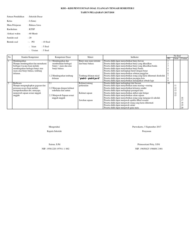 Berbagi ke twitter berbagi ke facebook bagikan ke. Berikut ini kisi kisi soal tematik bahasa indonesia kelas 5 untuk dijadikan sebagai format dasar oleh guru ketika sedang menyusun soal latihan atau ujian. Bagi bapak dan ibu yang kebetulan mengajar di kelas 5 sd/mi dan belum mempunyai soal untuk ulangan harian, ini mungkin bisa dijadikan referensi untuk digunakan di sekolah. Soal uts bahasa jawa kelas 1 dan kunci jawaban. Kompetensi inti kompetensi dasar materi nomor.